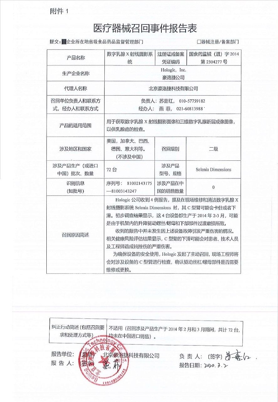 北京豪洛捷科技有限公司 报告,由于 Hologic公司收到4例报告,提及在现场维修和清洁数字乳腺X射线摄影系统Selenia Dimensions 时,其C型臂可能会卡住或者下滑。初步调查结果显示,这4台设备都生产于2014年2-3月,可能是由于机架内的升降驱动螺丝/螺母和下部部件过渡磨损所致。